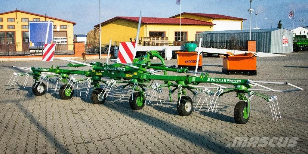 Rotary tedder PRONAR PWP770 is designed for spreading mowed, low stalk green plants and dried hay and spreading to scour the cuted plants in cultivated fields and meadows. Tedder swath PWP770 with a working width of 7,7 m with six rotors. Each carousel is provided with seven operating arms, which allows to obtain high performance operation (7,7ha / h). Active, cushioned suspension copies terrain. Easy to use does not cause problem for the operator which allows to quickly obtain the required operating parameters. Tedder can be aggregated with tractors cat.I and II according to ISO 730-1. With a weight of 915 kg, its power requirement 37/50 kW / hp.