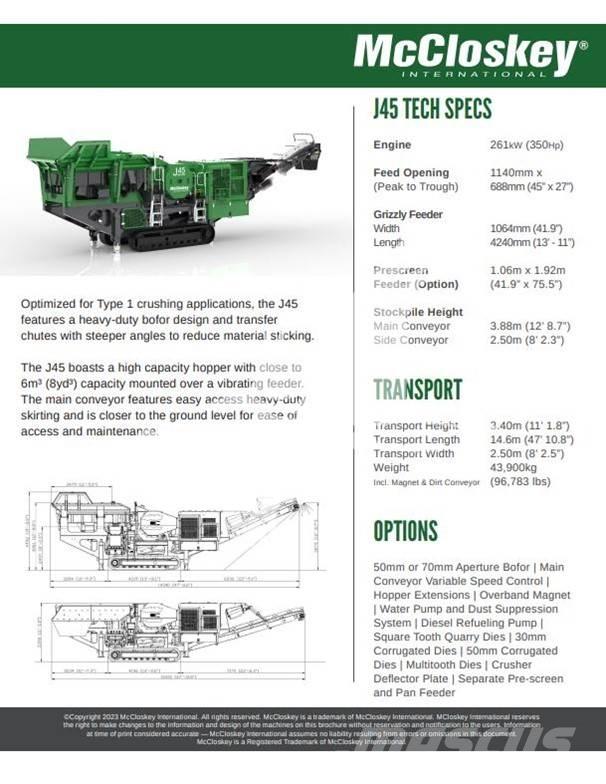 Description: * 45''x 27'' SINGLE TOGGLE JAW * INTEGRATED HYDRAULIC FOLDING HOPPER * INTEGRATED HYDRAULIC FOLDING STOCKPILING CONVEYORS * OPTIONAL PRE-SCREEN AND PAN FEEDER * LARGE GAP BETWEEN CRUSHER DISCHARGE AND MAIN CONVEYOR FEEDBOOT * OPEN CHASSIS DESIGN FOR EASE OF MAINTENANCE * FAST SETUP TIME * WE ARE A FULL MCCLOSKEY DEALERSHIP